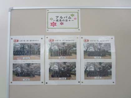2年生教室前の廊下の掲示板に桜の木の下で撮影した写真が掲示されました。授業参観の折にぜひご覧ください。