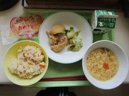 ちらし寿司、かきたま、鶏肉の唐揚げ、ちんげんさいのおひたし、牛乳、お祝いデザートでした。