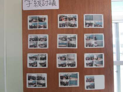 生徒玄関前に学級討議の写真が掲示されています。一人一人の意見が反映され、中学校の生徒会活動が展開されます。