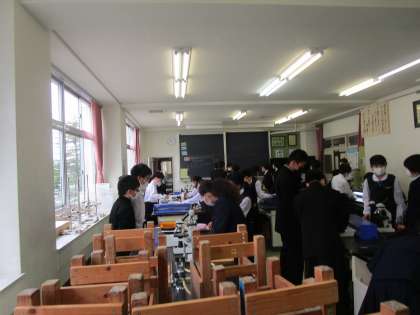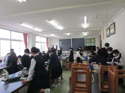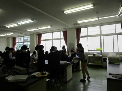 理科室で男女協力して顕微鏡で実験していました。