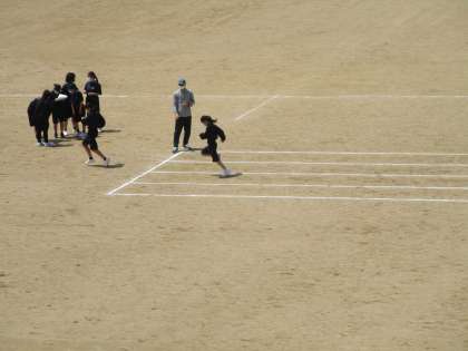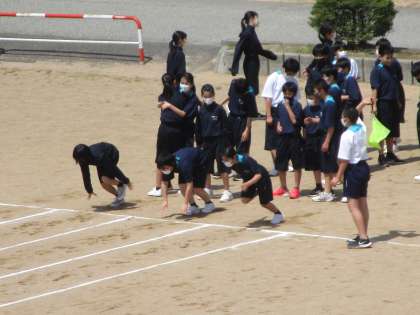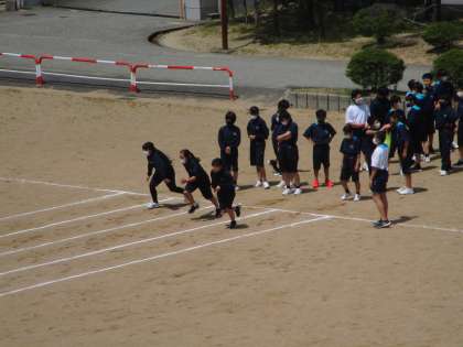 1年1組の保健体育は、50m走でした。足でクラウチングスタートの位置を確認し、スタートし、ゴールしていました。