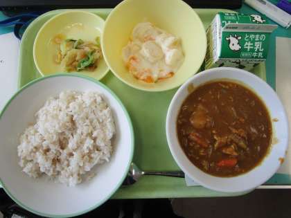 本日の給食は、麦ご飯、カレールー、フルーツヨーグルト、福神和え、牛乳でした。