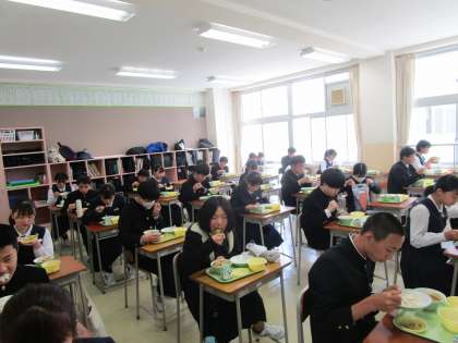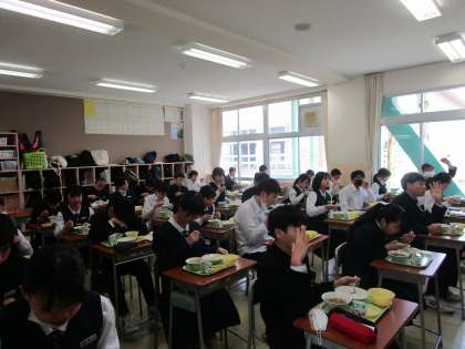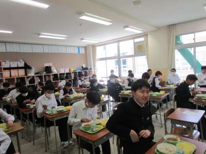 3年生の給食の様子です。すっかりコロナ禍の給食に慣れ、手早く準備し、黙食しています。