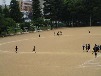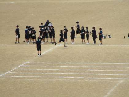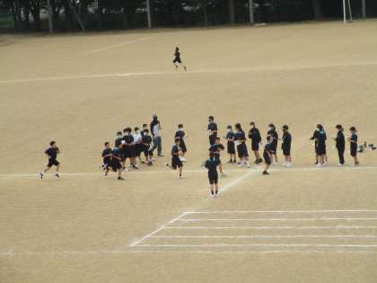 1年4組の保健体育は、グラウンドで持久走の練習でした。ペアを組んで残り何周やタイムを読み上げ、頑張っていました。
