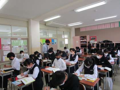2年1組の数学は連立方程式の学習をしていました。教育実習の先生も生徒にアドバイスしていました。