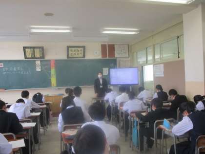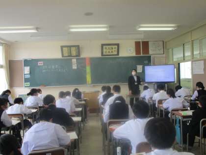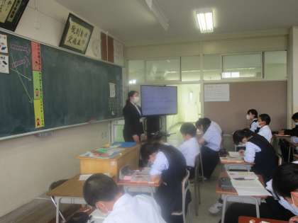 家庭科の教育実習の先生が頑張っています 公開日 2022/05/19 更新日 2022/05/19 1学年 家庭科の教育実習の先生が授業をしました。「五大栄養素と働きについて覚えよう」という課題で学習していました。緊張しながらも生徒に問いかけしながら頑張っていました。