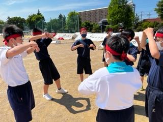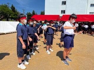 写真は、赤豹団の3年生が、1年生に団演技の動きを教えている様子です。