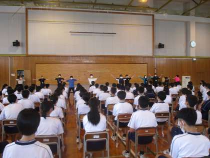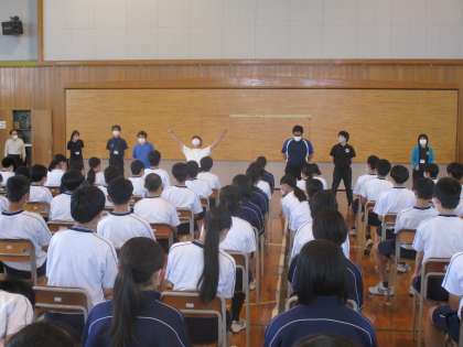体育大会予行が終わり、午後、体育館で明日の連絡をした後、学年の先生方からサプライズの生徒へのエールが送られました。