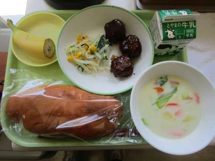 本日の給食は、コッペパン、ほたてのクリーム煮、ミートボール、水菜のサラダ、バナナ、牛乳でした。