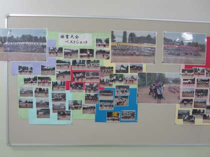 3年生教室前廊下の学年掲示板に「体育大会ベストショット」が掲示されました。生徒が休み時間、食い入るように見ていました。