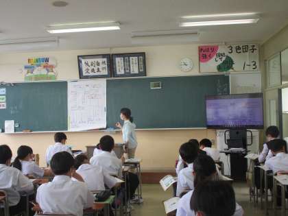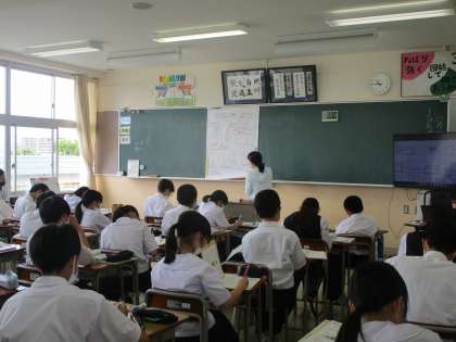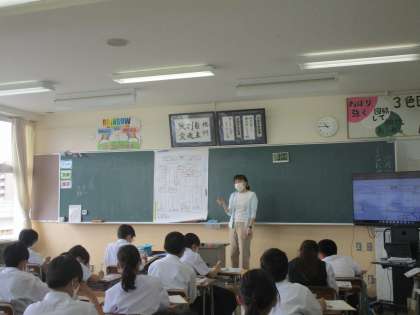 1年3組理科は、植物の分類の総まとめでした。生徒とともに植物を分類し、具体例をあげながら確認していました。
