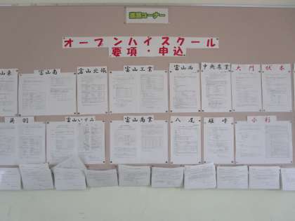 進路に向けて オープンハイスクール申し込み 公開日 2022/06/01 更新日 2022/06/01 3学年 3年1組の横の進路の掲示板に、いよいよ高等学校等のオープンハイスクールの申し込みが掲示されました。6月8日(水)までが校内締め切りです。ご家庭でも進路について機会を見つけて相談ください。学校でも教育相談で担任等と相談しています。