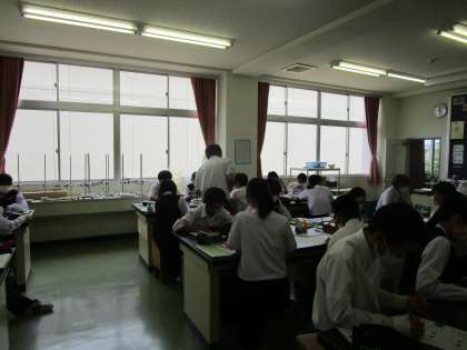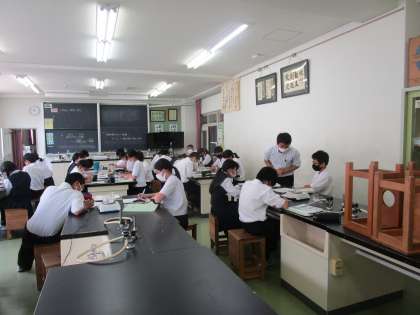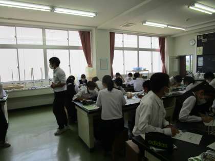 2年5組 理科 公開日 2022/06/01 更新日 2022/06/01 2学年 2年5組の理科は、理科室で化学反応と質量の変化について学習していました。ワークで化学反応式を確認したり、実験して確かめていました。