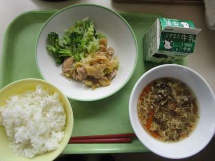 本日の給食は、ごはん、あっさりチキン、卵ともずくのスープ、そえ野菜、牛乳でした。