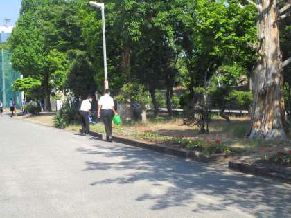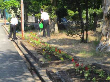 環境委員が当番で水やりをしてくれています。グラウンド横の花壇と生徒玄関前のプランターにたっぷり水やりしてくれています。