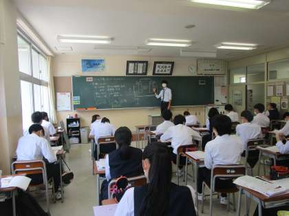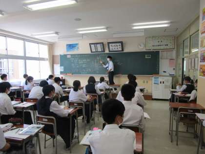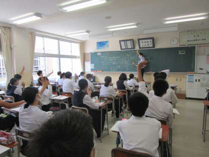 教育実習の先生が授業をしています。身振り、手振りをいれながら分かりやすく教えていました。実習もあと2日です。