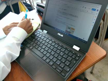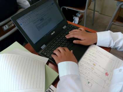 Chromebookで教科書の文を加筆・削除したり、先生からのコメントを見たりしながら下書きをしていました。筆者の文章の書き方を参考にして、わかりやすく説明するにはどうしたらよいか試行錯誤しています。