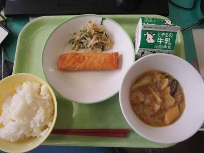 本日の給食は、ごはん、八宝菜、春巻き、塩ナムル、牛乳でした。