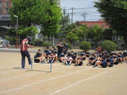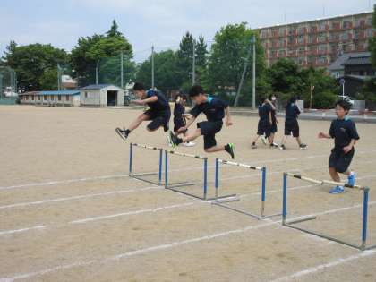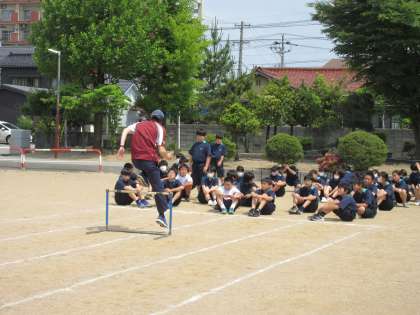 ハードルの授業でした。「振り上げ足をまっすぐ出そう」という課題で、何度もチャレンジしていました。