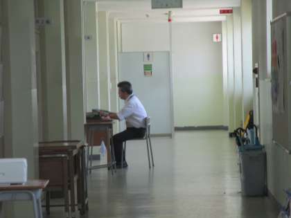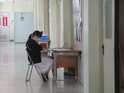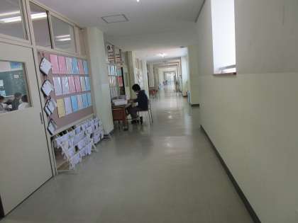 担任の先生が空き時間に廊下で生徒のマイライフを見たり、ワークを点検したり、クラスの授業の様子も参観しています。