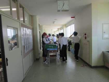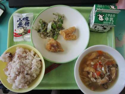 本日の給食 公開日 2022/06/10 更新日 2022/06/10 学校だより 本日の給食は、「よくかんで食べよう」ということで雑穀入りごはん、すいとん、鶏肉の唐揚げ、ゆかり和え、味付け小魚、牛乳でした。 マイエプロンでの準備もスムーズになりました。