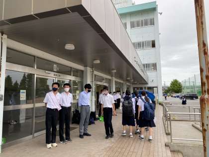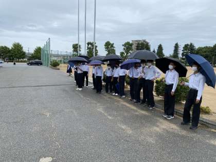 生活委員会の企画による「部活動あいさつリレー」で男子ソフトテニス部が魂のこもったあいさつをしていました。