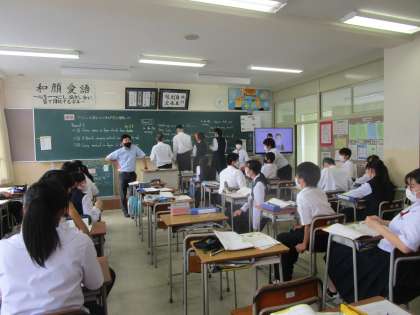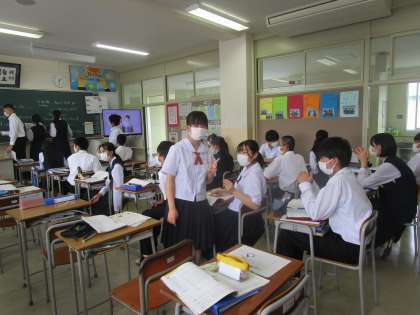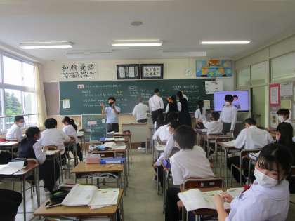 2年2組の理科は、黒板に生徒が英語の答えを書いていました。友達同士で教え合いながら学習していました。