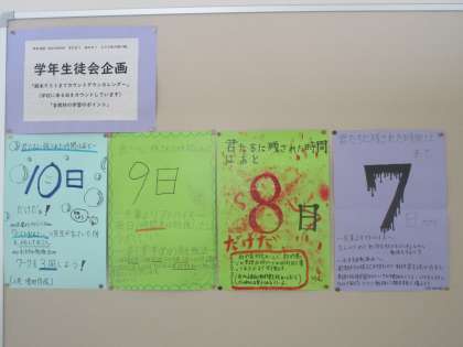 1学年 期末考査に向けて 公開日 2022/06/16 更新日 2022/06/16 1学年 期末考査までカウントダウンカレンダーが掲示されています。学習の仕方も紹介され、学年生徒会で学習への雰囲気を盛り上げています。頑張りましょう。