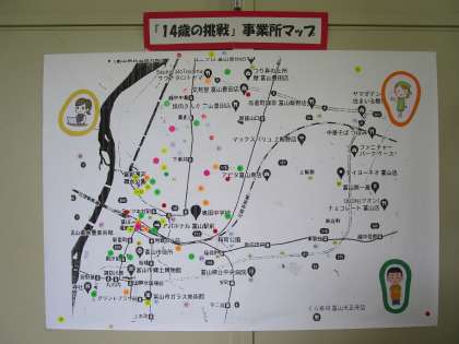 14歳の挑戦に向けて 公開日 2022/06/22 更新日 2022/06/22 2学年 14歳の挑戦でお世話になる事業所をマップにまとめました。 自分が行く事業所以外にどんな事業所があるのか、どんな場所があるのか一目で分かる掲示物になっています。