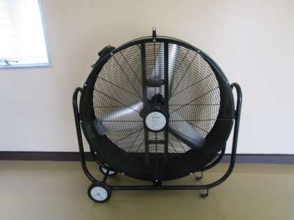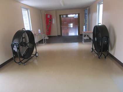 体育館にも大型扇風機を用意し、暑さをしのぐようにしました。