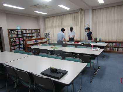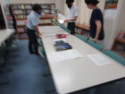 社会に学ぶ14歳の挑戦の本部は図書室になっています。巡回の打合せや保護者ボランティアのグッズ等の確認、本日学校に登校している生徒の指導等手分けして行っています。