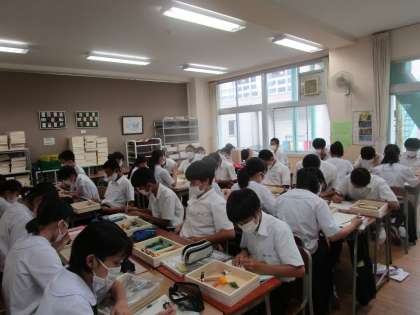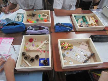 3年4組 美術 公開日 2022/07/04 更新日 2022/07/04 3学年 3年4組の美術は、アッサンブラージュの制作を行っていました。イメージを考え、箱の中に自分の考えたイメージを表現していました。