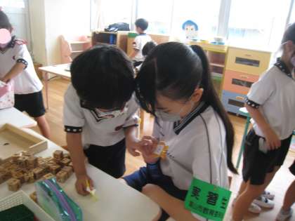 園児たちは、お姉ちゃん先生の名札が気になるようです。