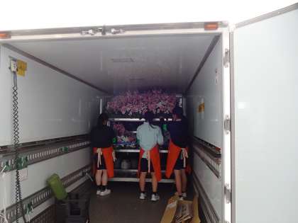 トラックから花を降ろそうとしています。「花に囲まれた」仕事を体験できてとてもうれしいしやりがいがあると答えていました。