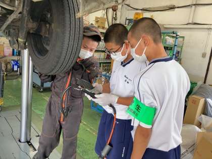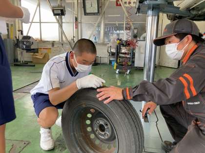 車の整備について勉強していました。タイヤの空気圧を測定したり、タイヤの溝の深さを調べたりしていました。
