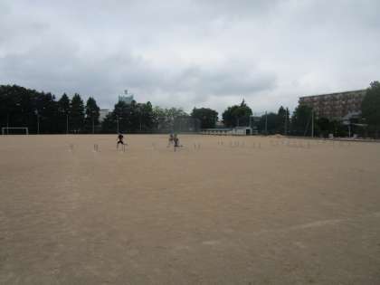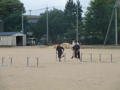 1年2組の保健体育は、久しぶりにグラウンドでハードルをしました。記録更新を目指して頑張って跳んでいました。