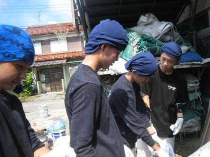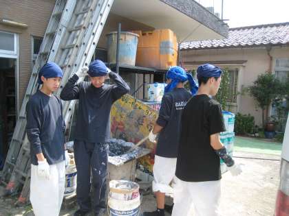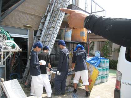 廃棄するペンキを固めています。暑いなか、タオルを巻いて頑張っています。