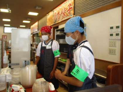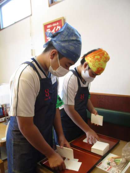 持ち帰り容器のふたにシールを貼るなど、黙々と作業しています。細かい気遣いが大切です。