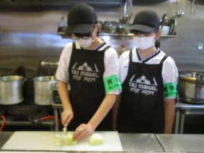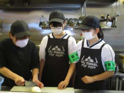 アルバイトと同じ仕事をしています。えびのからむき、玉ねぎを切るなど、本格的に体験させてもらっています。