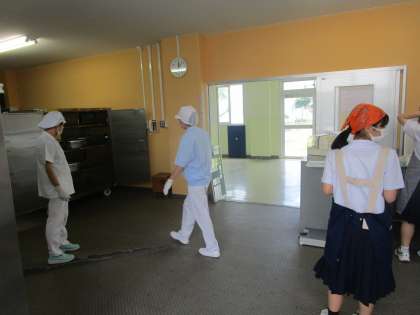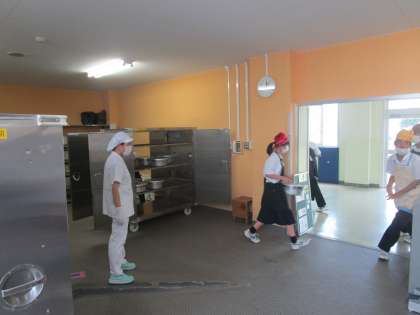 いつも給食ありがとうございます 公開日 2022/07/06 更新日 2022/07/06 学校だより 給食配膳員の2人の方が北給食センターから運ばれた給食を学年、クラスに配膳していただいています。4階に運ばれた食材も所定の場所に運んでいただいています。 暑い中、北給食センターの方、トラックの運転手さん、パンやご飯を運んでくれていただいる業者の皆さん、給食配膳員の方など、いつもありがとうございます。