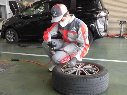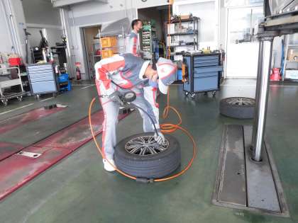 自動車のタイヤに空気を入れている様子です。作業着がとてもよく似合いかっこいいですね。