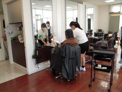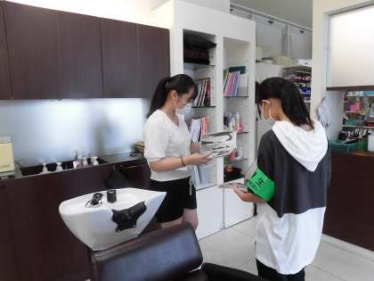 美容院の様子です。雑誌の間に挟まっている髪の毛を取り除いたり、お客様に飲み物を出したりしていました。