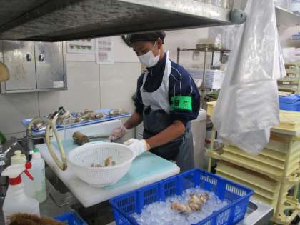 いかの皮むきやバイ貝の殻割りをしていました。一生懸命活動していました。