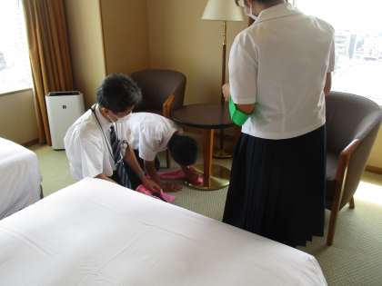 14歳の挑戦 3日目 46 公開日 2022/07/06 更新日 2022/07/06 2学年 部屋の最終確認の作業をしていました。 お客様が気持ちよく過ごしていただけるよう、テレビの周り、ソファーのごみ、コップの汚れなどを一つ一つ確認するという内容でした。 これからホテルに泊まった時に、このような手間をかけていただいているのだと感謝できるようになりたいですね。