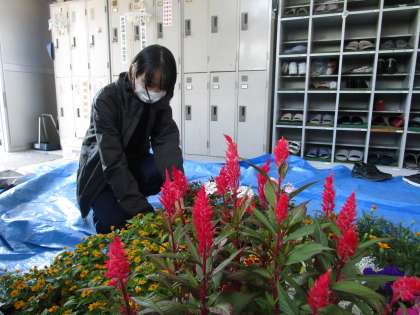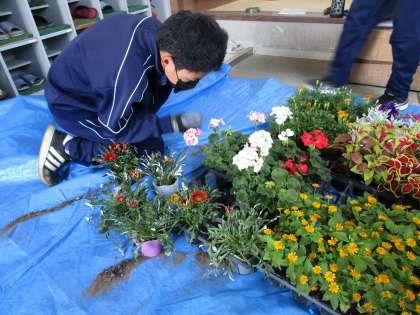 花壇に植える花を選んでいました。社員の方に花の名前を教えていただき、花を観察していました。