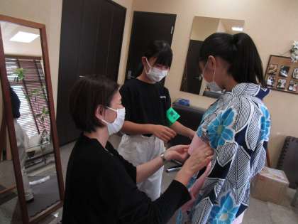 お互いに、浴衣の着付けをしていました。