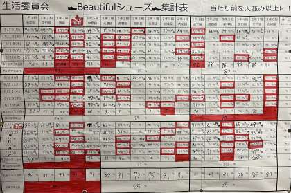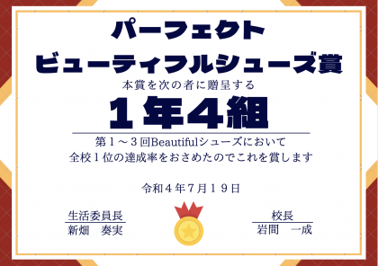 98%で1学期全校1位だった1年4組には、校長先生から、パーフェクトビューティフルシューズ賞が授与されます。