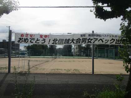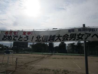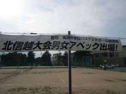 奥田中学校バスケットボール後援会に作っていただいた横断幕を今年も男女アベック出場でテニスコートのネットに掲げることができました。大会等でいつもOB、OG、そしてその保護者の方や親戚の方などからバックアップしていただき、大会に参加させてもらっています。ありがとうございます。1戦、1戦、虚心坦懐の気持ちで精一杯頑張ってきます。