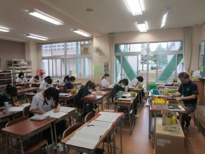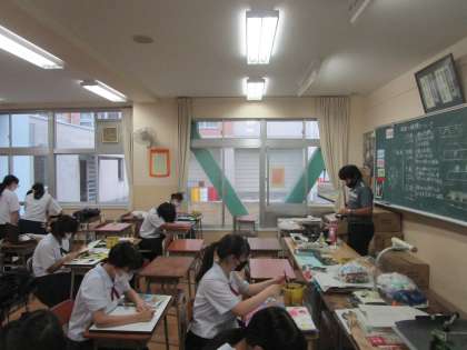 美術部が美術室でじっくり作品制作に取り組んでいました。2人の顧問の先生も一緒に取り組んでいました。