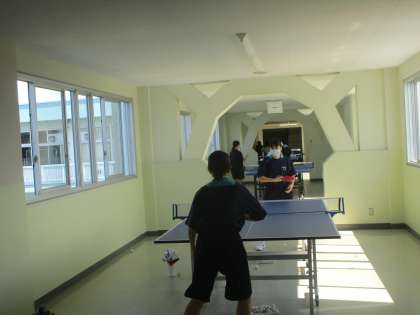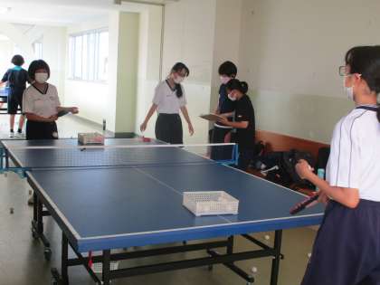 4階渡り廊下で女子卓球部が練習していました。顧問の先生と相談しながら活動していました。